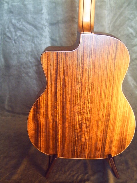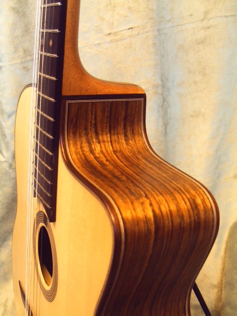 * Die Klangdecken meiner Sinti-Jazz-Gitarren erhalten ihren authentischen Gypsy-Klang durch die besondere Art der Wölbung im Stegbereich, wodurch dieser Bereich sehr dünn ausgearbeitet werden kann und die gesamte Decke zu einer akustischen Einheit wird, die den extrem druckvollen charaktischen sound meiner Sinti-Jazz- Gitarren ausmacht. |