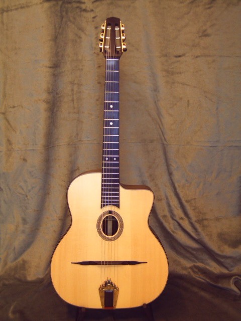 Selmer-Maccaferri-Style) Back/Sides: solid Ovengkol or Sapelli Fingerboard/Bridge: Rosewood Neck: Cedro, with Truss-Rod Finish: satin available with oval-shaped Soundhole (Selmer-Style) or D-shaped Soundhole (Selmer/Maccaferri-Style) with short (64,8cm) or long (67cm) Scale authentical Gypsy-Swing-Sound with
